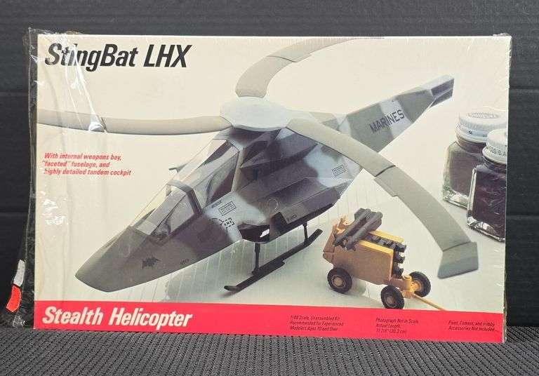 DescriptionTestors Italeri StingBat LHX Stealth Helicopter Model Kit. 1/48 Scale. Opened, unstarted Sprues are intact. Instructions and decals present and intact. Kit No. 636