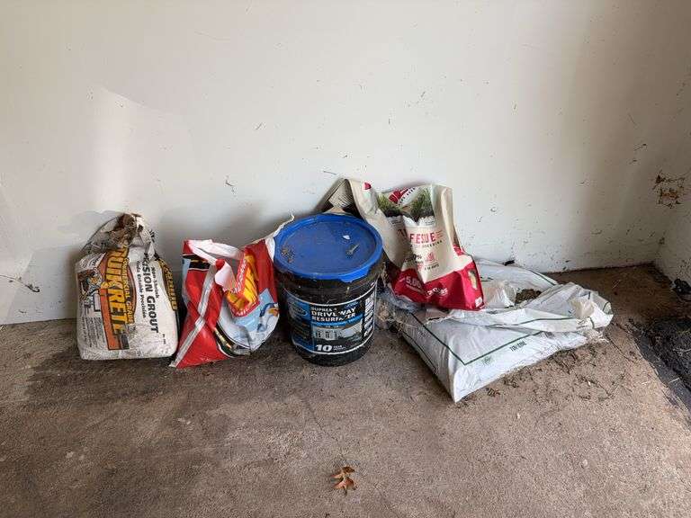 Open containers of Ice Melt, Grout, Fescue Seed, Top Soil, Driveway Resurfacer; quantities very