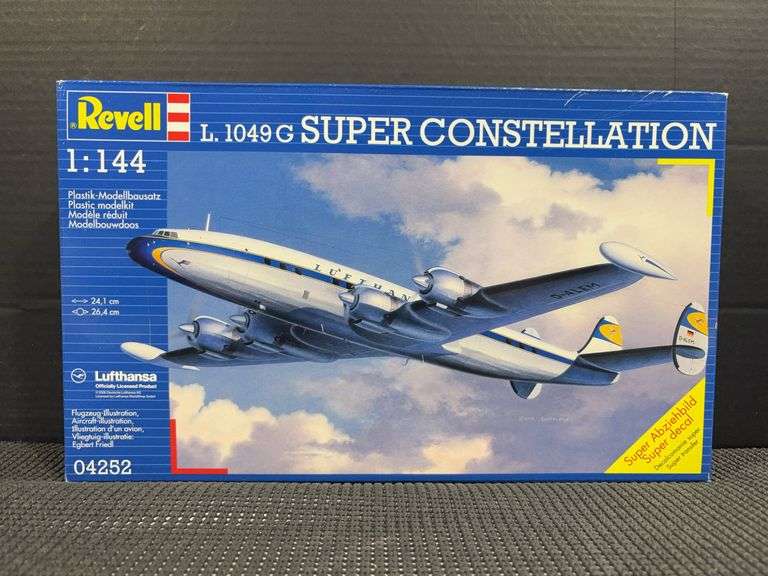 DescriptionRevell L.1049G Super Constellation model kit. 1:144 scale. Factory Sealed Kit #04252.